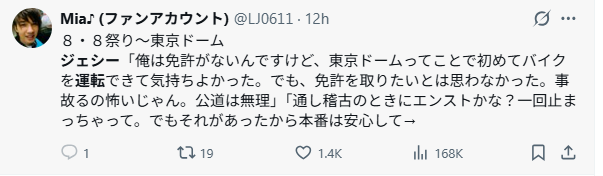 東京ドームでのバイクの運転も本当に素敵でした。